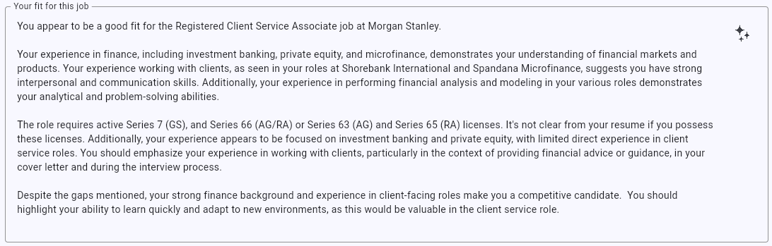 Simply paste the job description into Candidus, and our AI will analyze your fit for the role, and give you feedback on what to emphasize and where to brush up.